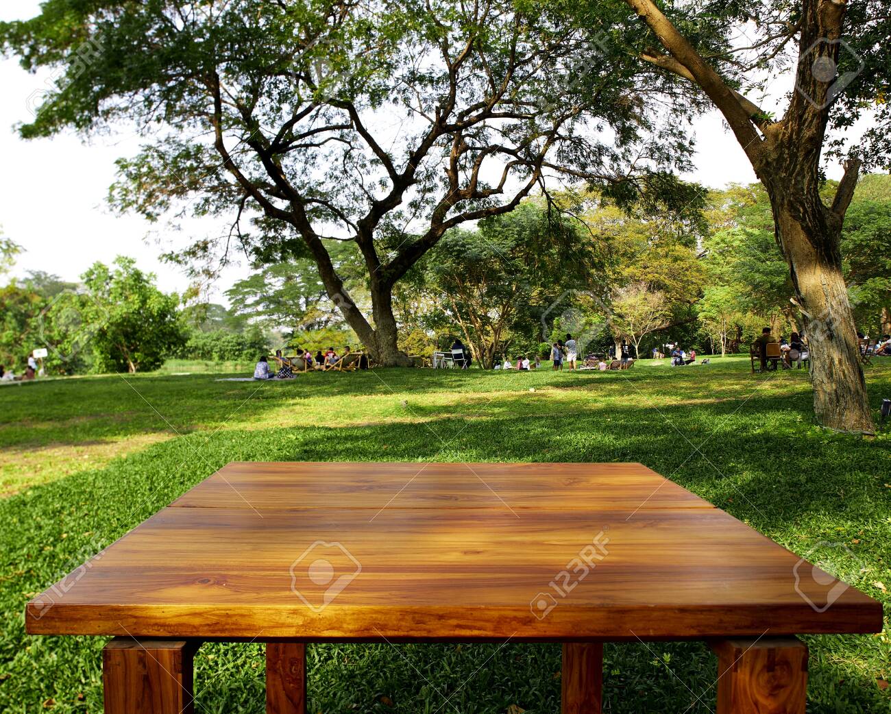 Wooden Board Empty Table Top On Of Garden Blurred Background