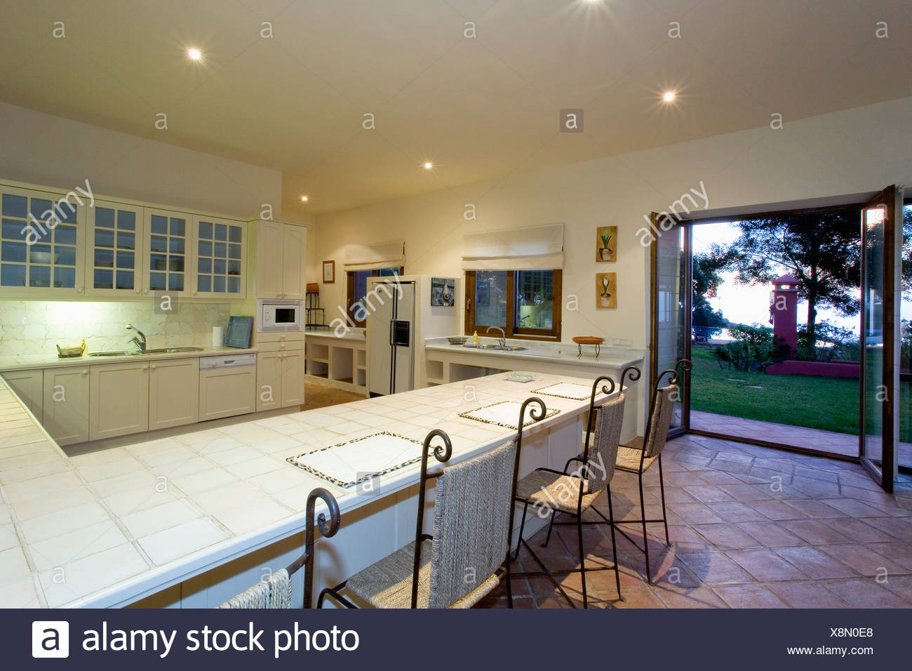 In this small west london garden designed by richard miers garden design a built in bench is piled high with plump decorative cushions and lit by lanterns at night creating a pretty seating area.