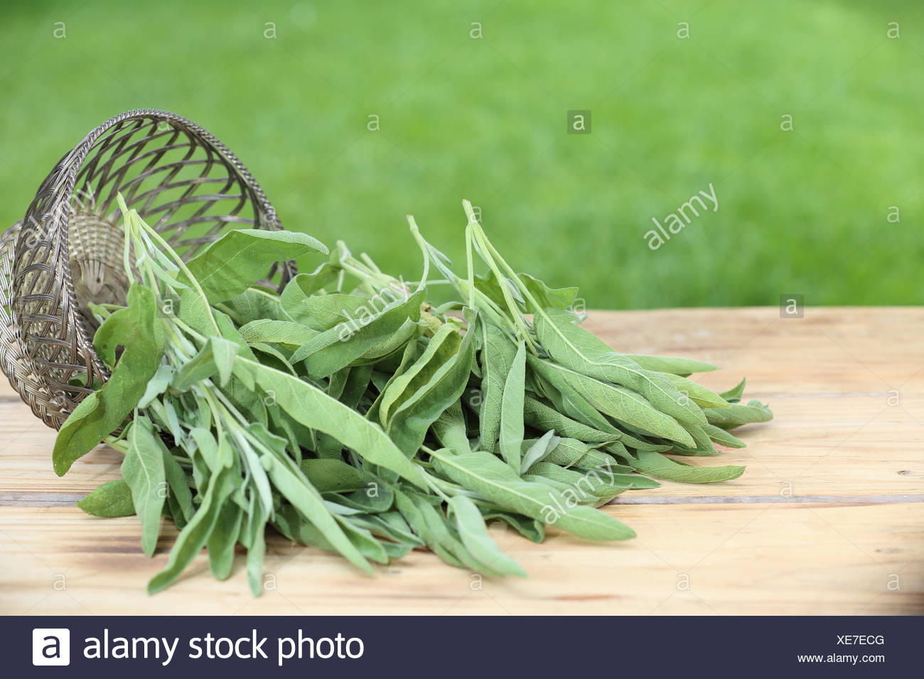 Sprigs Of Fresh Sage Tumbling Out Of A Basket On A Wooden Garden