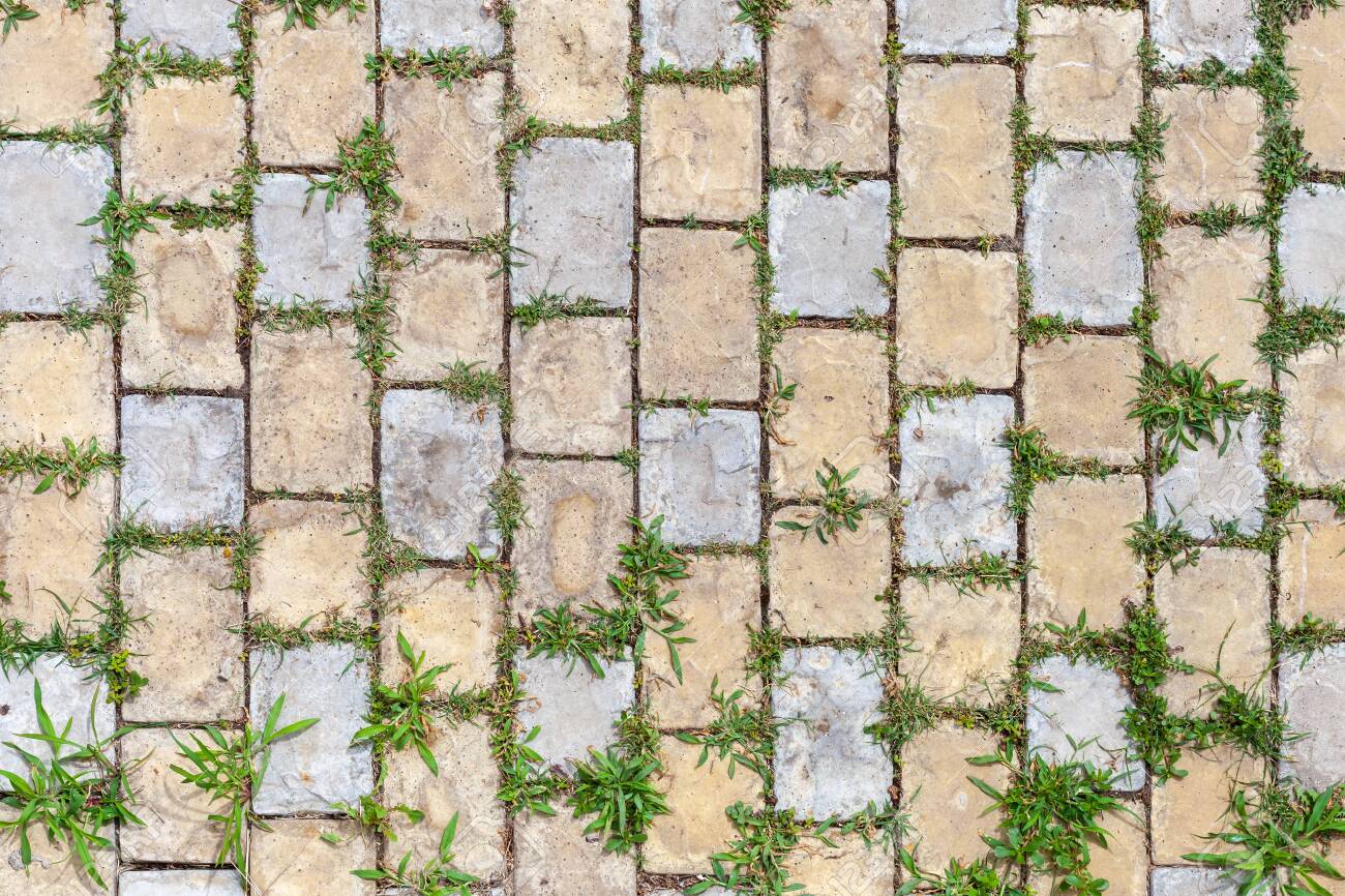 Green Grass Growing Through The Cobble Stones Outdoor Garden