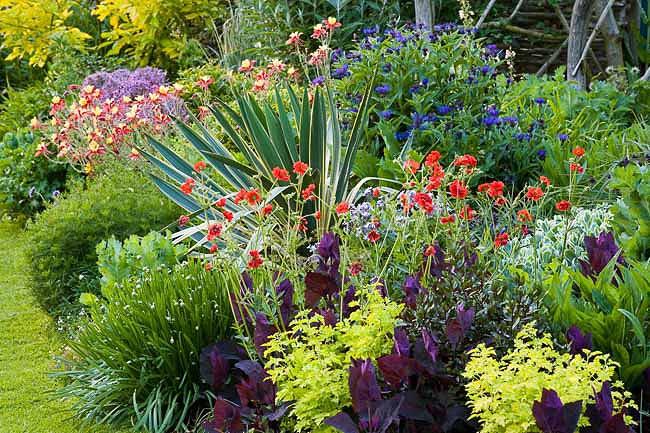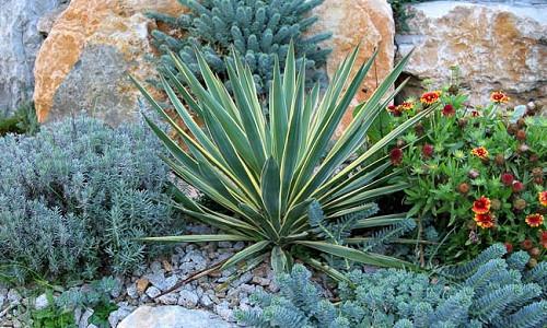 Yucca filamentosa color guard zones. An easy care mediterranean garden idea looking good all year long this mediterranean garden includes a number of iconic elements of provencal or tuscan gardens such as olive trees lavender cotton santolina thyme thymus or shrubby bindweed convolvulus. Similar to golden sword this cold hardy yucca brings color to dry gardens.